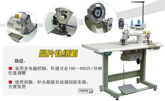 | 該機(jī)器采用全自動(dòng)選送金片設(shè)置,被廣泛用于平繡和晶片繡作。
